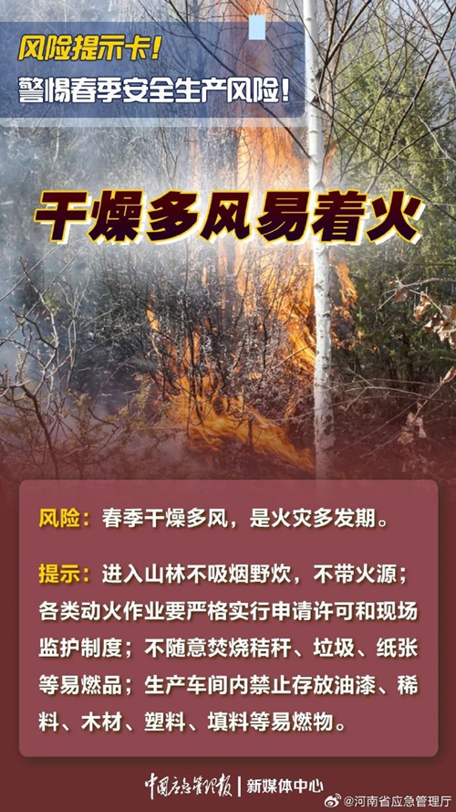 春季天氣多變,各行業(yè)復(fù)工復(fù)產(chǎn)步入正軌,生產(chǎn)節(jié)奏不斷加快的同時(shí),應(yīng)結(jié)合春季安全生產(chǎn)特點(diǎn)及時(shí)落實(shí)各項(xiàng)安全防范措施 ???。