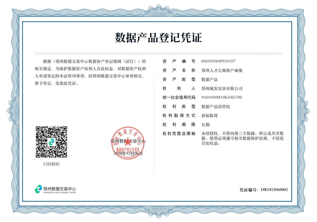 12月6日,鄭州城市發(fā)展集團(tuán)有限公司下屬子公司鄭州城發(fā)安居有限公司(以下簡(jiǎn)稱“城發(fā)安居”)在鄭州數(shù)據(jù)交易中心成功完成了“鄭州人才公寓租戶畫(huà)像”的資產(chǎn)登記,正式取得數(shù)據(jù)產(chǎn)品登記憑證,成為鄭州首例將人才公寓運(yùn)營(yíng)數(shù)據(jù)資產(chǎn)入表的市屬國(guó)企。