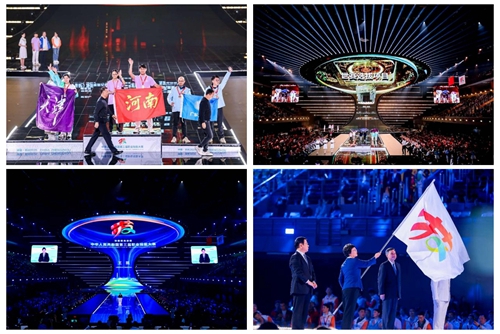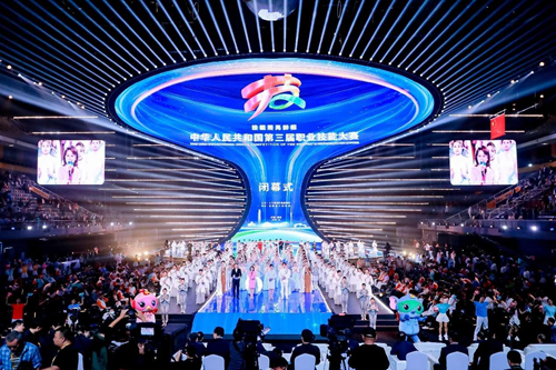 華燈璀璨,掌聲如潮。9月23日晚,當(dāng)348名獲獎(jiǎng)選手高舉隊(duì)旗與獎(jiǎng)?wù)?,?dāng)大賽會(huì)旗在璀璨的舞臺(tái)上完成交接傳遞,當(dāng)良渚文化和人形機(jī)器人在現(xiàn)場(chǎng)8000余名觀(guān)眾的歡呼聲中共舞……中華人民共和國(guó)第三屆職業(yè)技能大賽閉幕式在鄭州奧體中心體育館完美落幕!