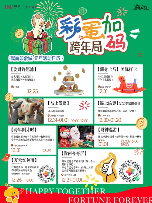 12月31日-1月3日,憑快樂幣可免費騎小馬、抽獎、兌換零食禮包,輕松實現(xiàn)童趣與味蕾雙重滿足??缒暌?,商場營業(yè)時間延長至23:00后自然閉店,大屏同步跨年倒計時,和親友一起在歡呼聲中迎接2026,氛圍感直接拉滿!